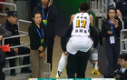 随后,孙铭徽就躺在地上,捂着自己的脚,显得十分痛苦,队医对他进行简单治疗之后,他还是无法行走,最后,队友将孙铭徽背出了赛场。
